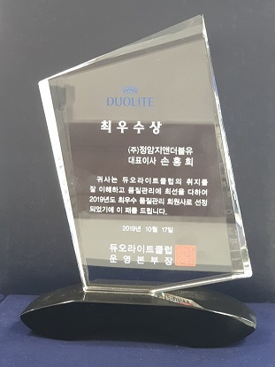(주)정암G&W(대표이사 손홍희)가 지난 10월 18일 제주도 사이프러스CC에서 개최된 한글라스 듀오라이트클럽 사장단 워크샵에서 최우수 대리점에 선정됐다. 한글라스는 매년 우수 대리점 시상식을 개최하고 있다. 선정기준은 현장 품질평가와 코팅유리 원판 사용량 및 협조도 등을 통해 시상하고 있다.